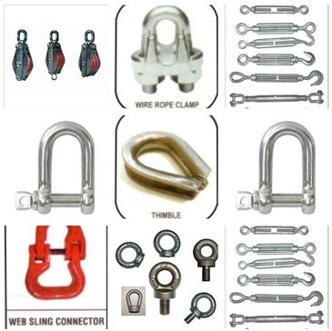 Consumable items like Wire rope pulleys , clamps , turnbuckles , thimbles , D-shackles , U- bolts , Eye - bolts , other various kinds of items for daily use .